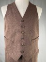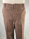 Mens, 1970s, 3 Piece Suit, 42, Reg, Brown, White, Wool, Pinstripe, Sears And Roebucx, Jacket, Two Button Wide Peak Lapel With Two Flap Pockets And One Welt Pocket At Left Chest, Tortoise Shell Buttons And Three Small Tortoise Buttons At Cuff, Brown Satin Lining, Excellent
